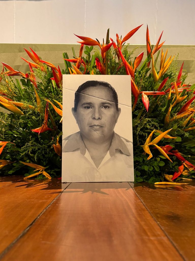 Uma foto de Dona Máxima Pires, importante líder comunitária do Rio dos Cachorros — região onde a reserva está prevista para ser decretada — foi colocada em frente à mesa que conduziu os trabalhos.
