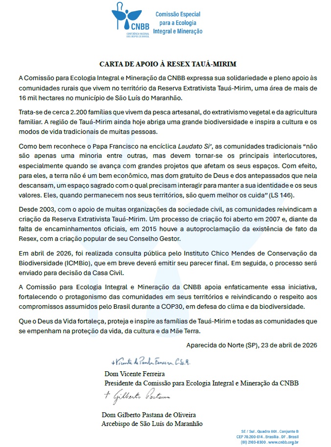 A mobilização pela criação da Reserva Extrativista (Resex) Tauá-Mirim, em São Luís, ganhou mais um importante reforço com a divulgação de uma carta de apoio da Comissão para Ecologia Integral e Mineração da Conferência Nacional dos Bispos do Brasil (CNBB).